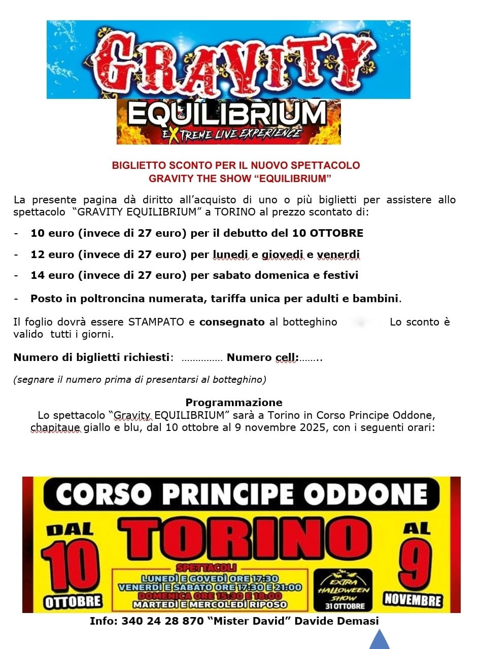 Il nuovo spettacolo della troupe del “Gravity Show”, “EQUILIBRIUM“ approda a Torino, dal 10 ottobre al 9 novembre, in Corso Principe Oddone a Torino, ospitato nello chapiteau giallo e blu.