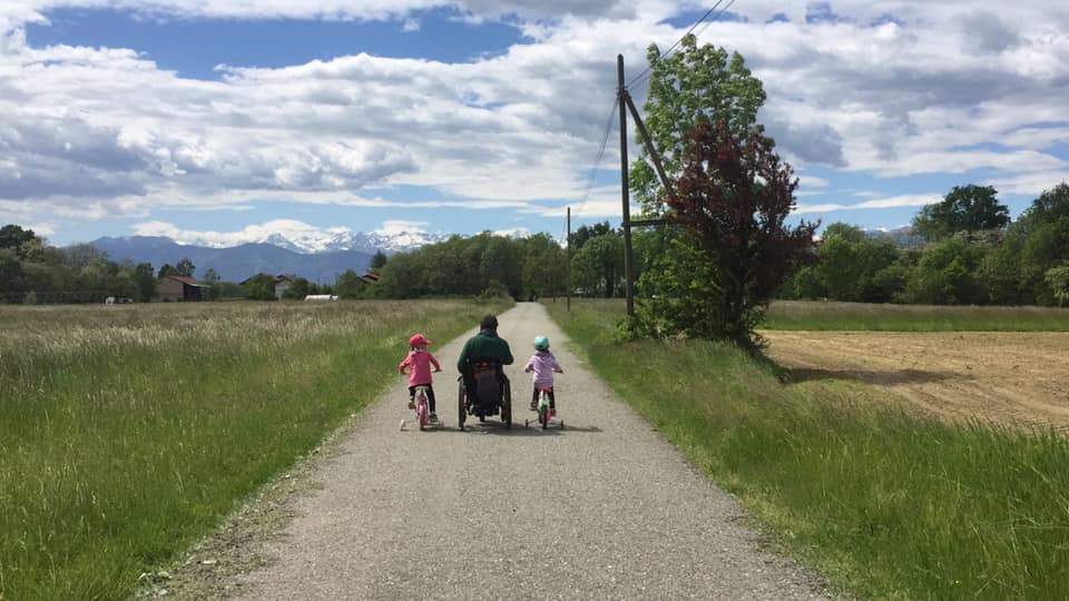 “Da sempre, quando le bambine non hanno voglia di camminare, si siedono sulle mie gambe e andiamo in tre sulla carrozzina grazie a una ruota elettrica che aggancio anteriormente e trasforma il mio mezzo in una specie di bicicletta.